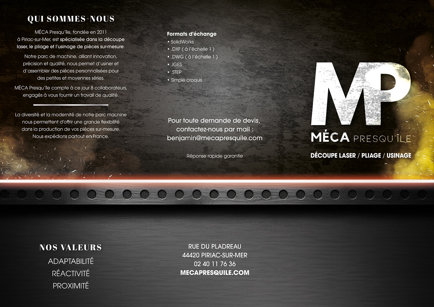 Que vous soyez une PME locale ou une plus grande entreprise, chez Méca Presqu’île, nous mettons notre savoir-faire et notre expertise à votre service pour des solutions personnalisées. Nous répondons à toutes vos demandes de découpe laser et pliage.